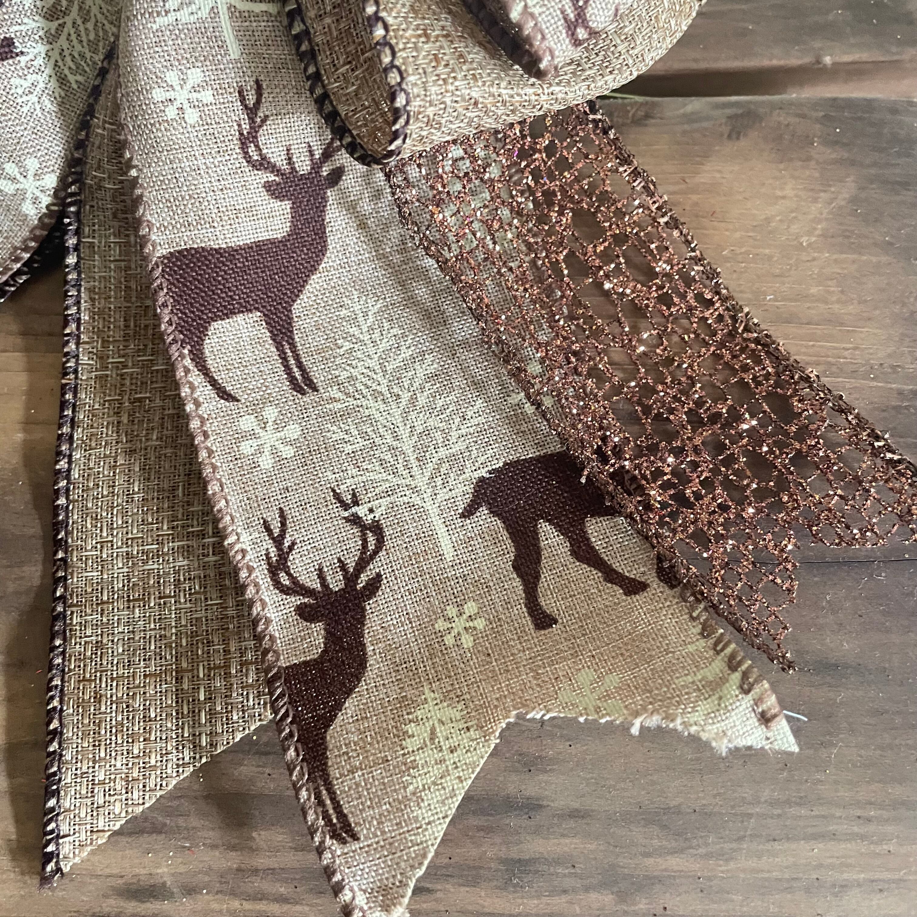 こげ茶のキラキララメ、麻地のような生地に白いツリーとトナカイ、麻袋のようなリボン。